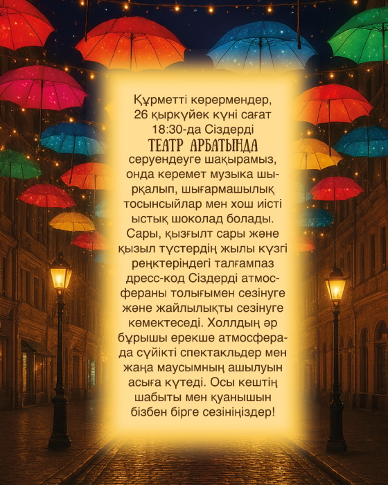 Күздің келуімен біз 49-шы театр маусымын ашуға қуаныштымыз және Сіздерді спектакль алдында ерекше кешке шақырамыз.