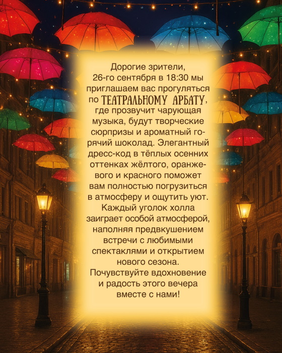 С приходом осени мы рады открыть 49-й театральный сезон и приглашаем вас на особый вечер перед спектаклем. 26 сентября в 18:30 прогуляйтесь по театральному Арбату, где прозвучит чарующая музыка, ждут творческие сюрпризы и тёплый шоколад. Элегантный дресс-код в осенних оттенках жёлтого, оранжевого и красного поможет погрузиться в уютную атмосферу вечера и предвкушение новых постановок.